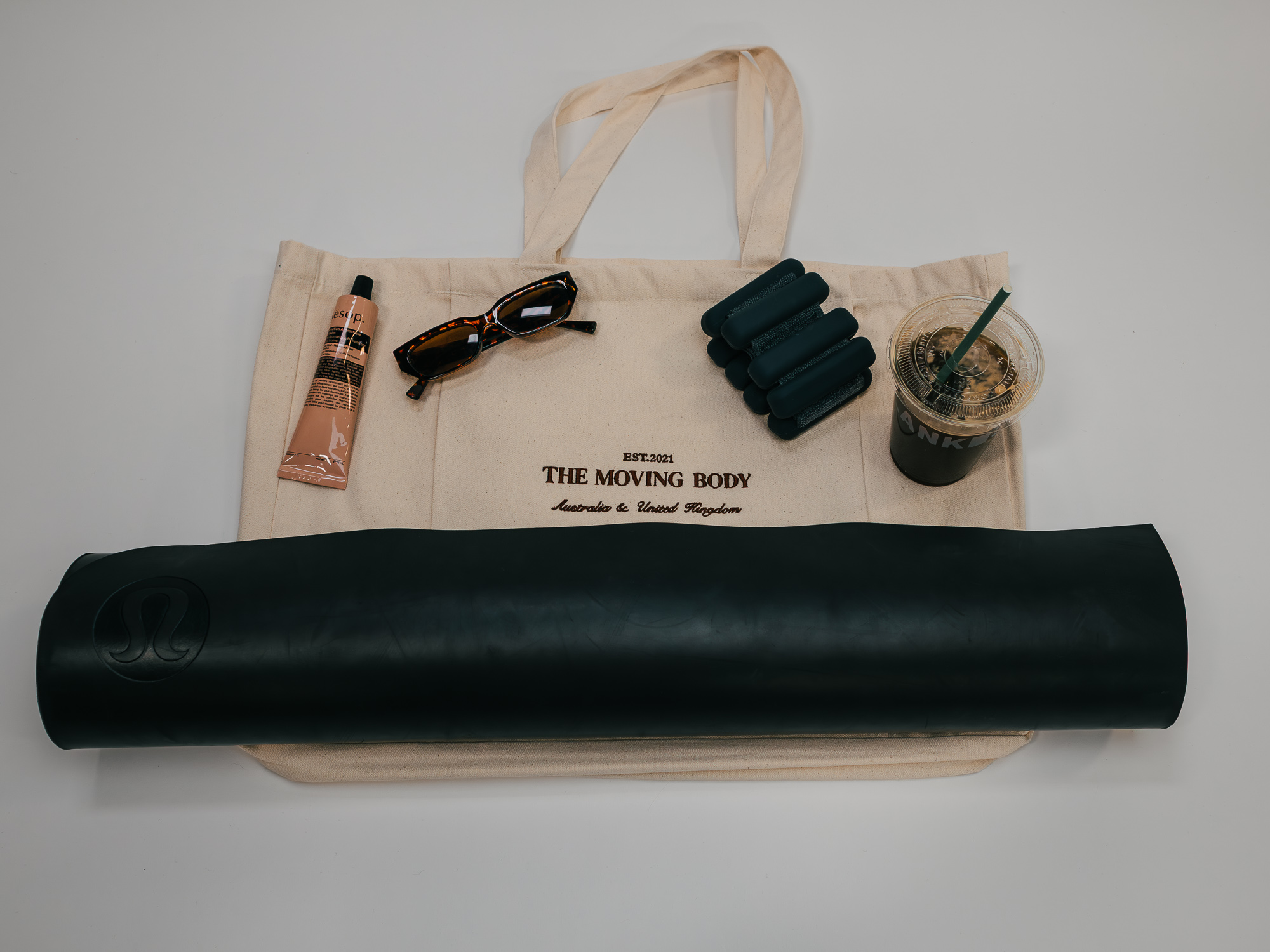 Our canvas tote with built-in mat bag pocket makes it easy to carry your essentials from studio to street — no juggling, no extra bags.